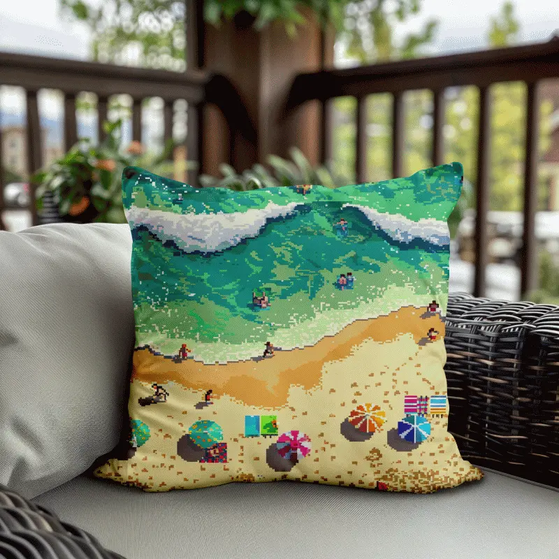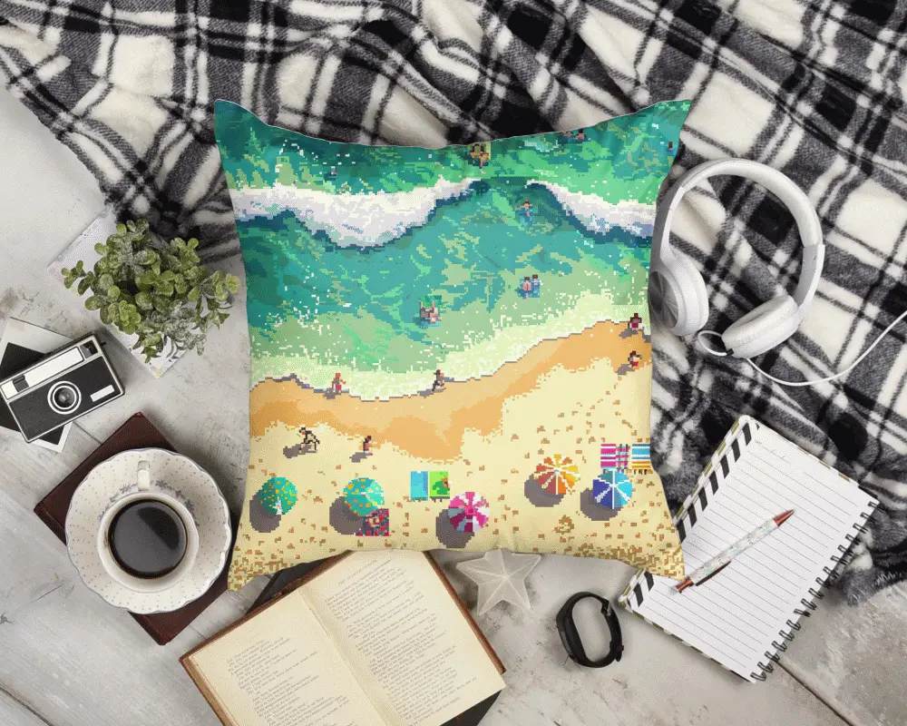 Hol dir pures Retro-Sommerfeeling nach Hause – mit dem 8-Bit Kissen! Sein detailreiches Pixel-Art-Strandmotiv fängt die entspannte Atmosphäre eines sonnigen Tages am Meer ein und versprüht Urlaubsstimmung mit nostalgischem Gaming-Charme. Klare 8-Bit-Grafiken in sanften Blau- und Sandtönen erinnern an klassische Videospiele der 80er und 90er und machen dieses Kissen zum perfekten Hingucker für Gamer und Strandliebhaber.