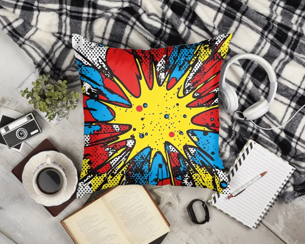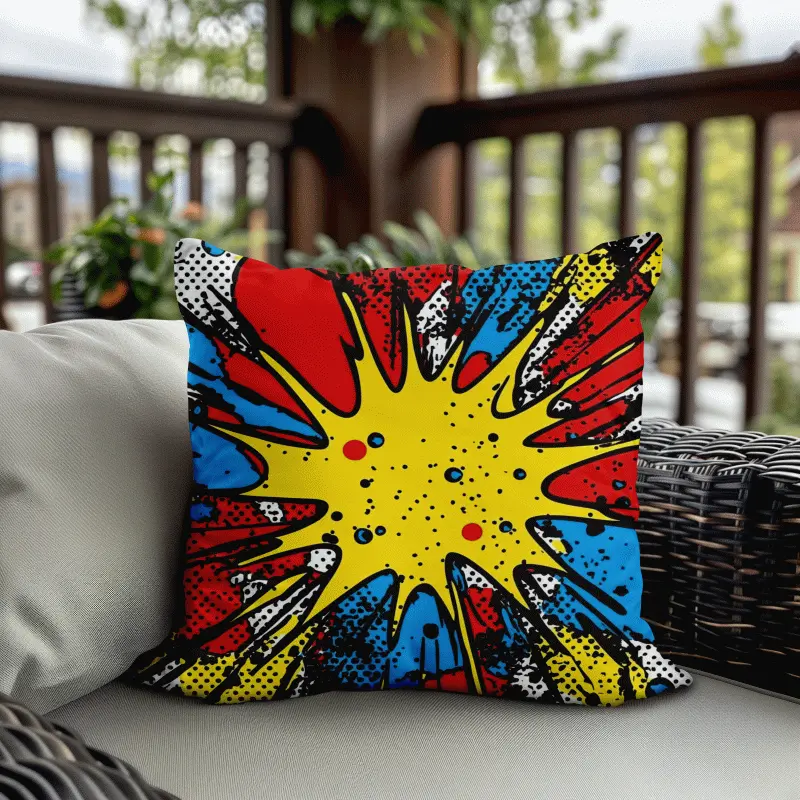 Mach dein Wohnzimmer zur Kunstgalerie im Pop-Art-Stil und setze mit dem Dekokissen „Pop Art Explosion“ ein echtes Statement! ????????