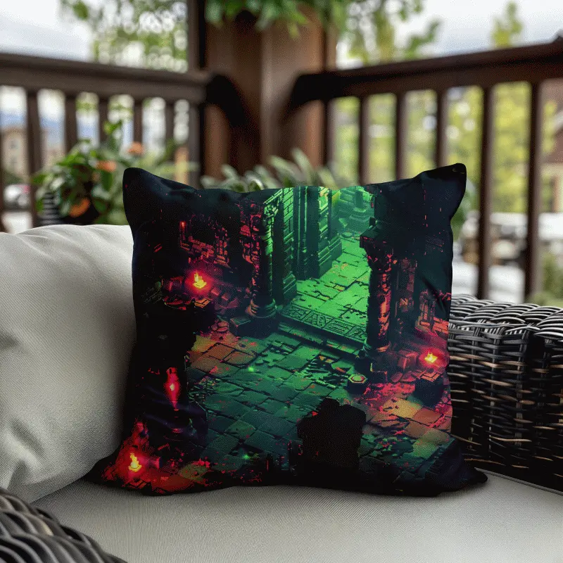 Betritt eine geheimnisvolle Fantasy-Welt mit dem Dungeon Kissen! Sein düsteres Pixel-Art-Design erinnert an klassische Retro-Rollenspiele und mystische Verliese, die nur mutige Abenteurer betreten. Mit seinen detailreichen Mustern und dunklen Farbtönen bringt dieses Kissen den ultimativen Gamer-Vibe in dein Zuhause und lässt nostalgische Gaming-Herzen höherschlagen.