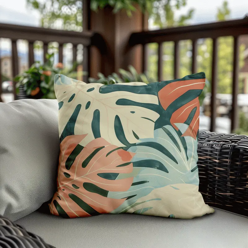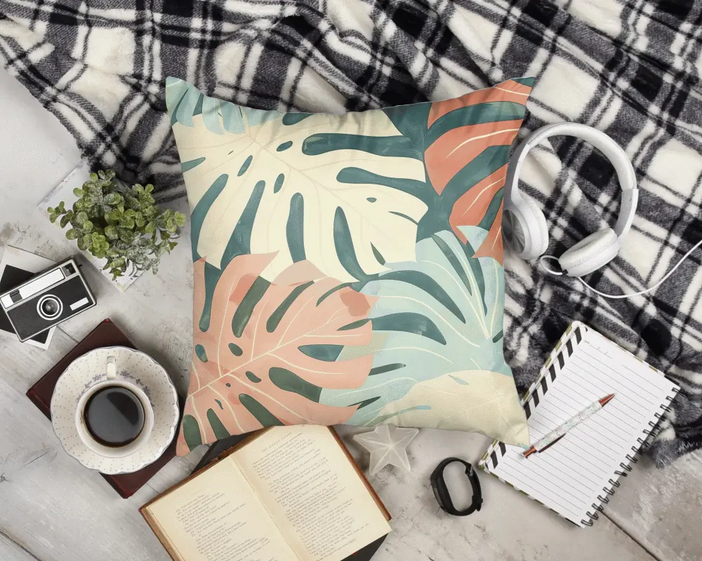 Bringe mit dem Pastel Kissen eine sanfte, tropische Atmosphäre in dein Zuhause! Das elegante Blätterdesign mit Monstera-Motiven in warmen Beige-, Blau- und Koralltönen verleiht jedem Raum eine harmonische, entspannte Ästhetik. Die weichen Pastellfarben erinnern an sonnige Strände, sanfte Meeresbrisen und sorgen für eine beruhigende, stilvolle Wohnatmosphäre.