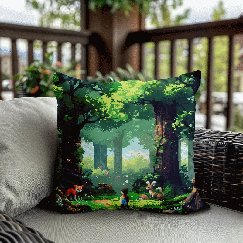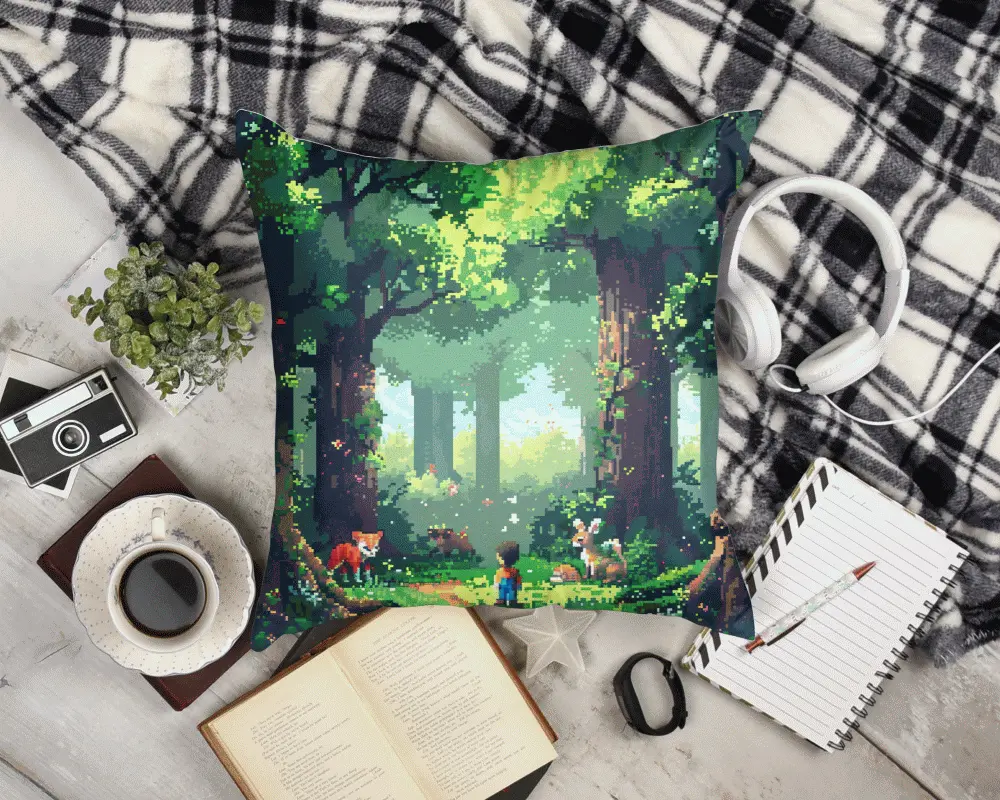 Bringe mit dem Retro Pixel Kissen die Faszination klassischer Gaming-Welten und eine verwunschene Waldstimmung in dein Zuhause! ????✨????