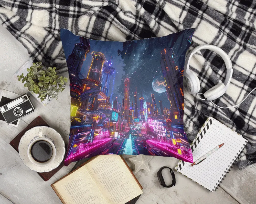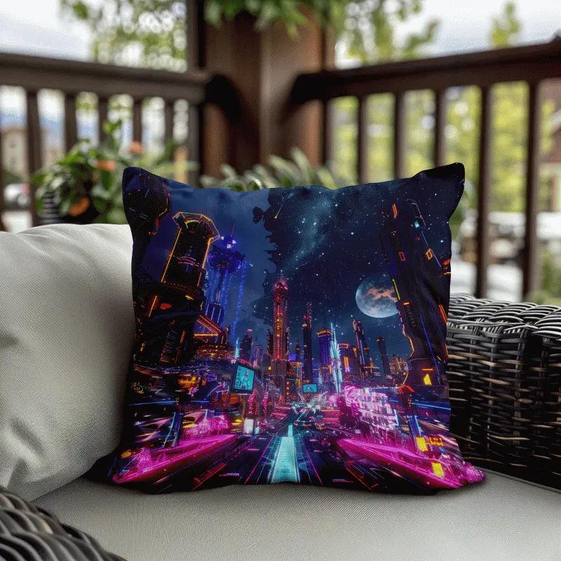 Ein Must-have für Sci-Fi-Liebhaber, Gamer und alle, die von der Stadt der Zukunft träumen – mit dem Sci-Fi Deko-Kissen setzt du ein leuchtendes Statement!